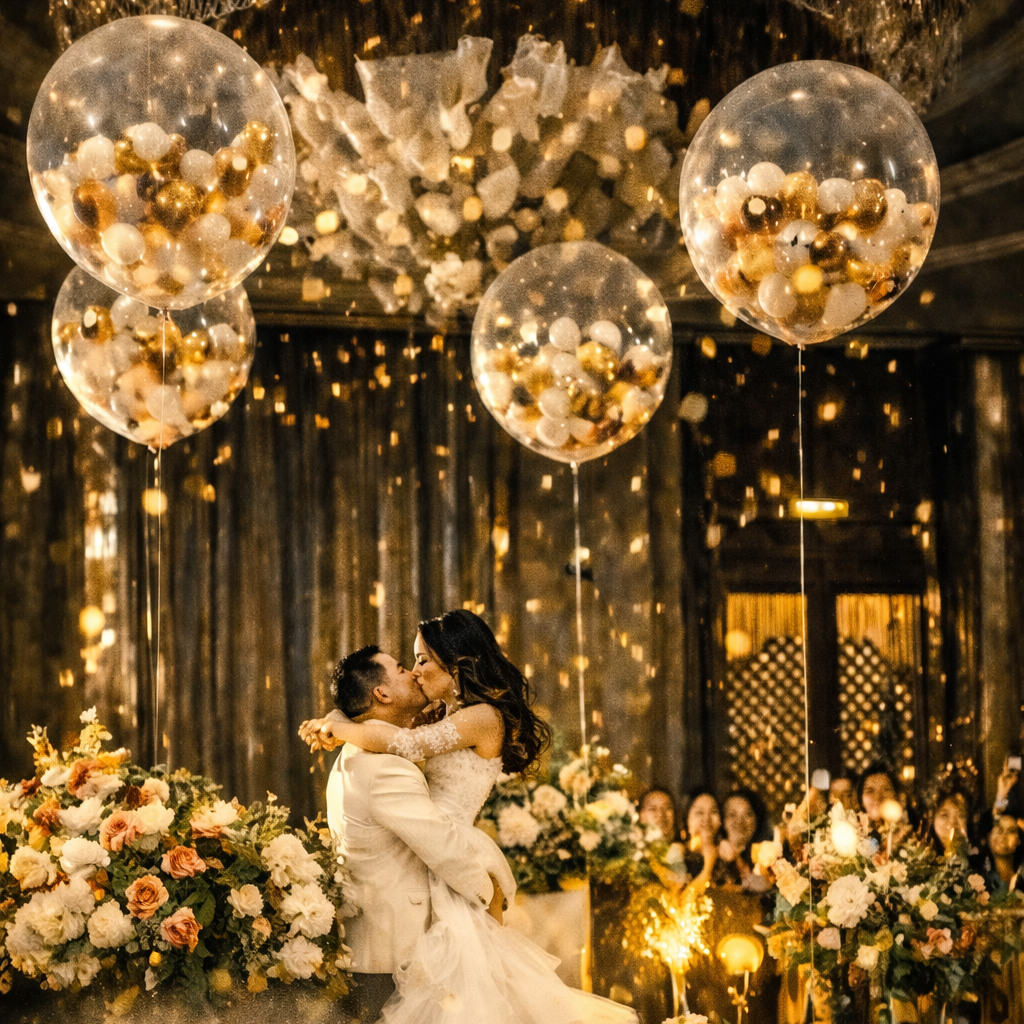 Τα μικρά μπαλονάκια που γεμίζουν το πάτωμα δημιουργούν ένα ζωντανό, πολύχρωμο και χαρούμενο σκηνικό — ιδανικό για φωτογραφίες και βίντεο.