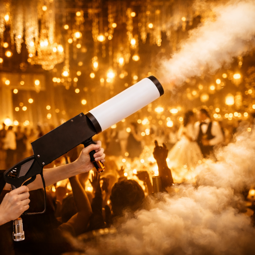 Τα CO₂ LED Guns δημιουργούν δυνατές στήλες λευκού καπνού. Το ύψος τους φτάνει έως και τα 8 μέτρα. Αυτό προσφέρει ένα μοναδικό club-style εφέ στην εκδήλωσή σας. Κάθε πιστόλι διαθέτει ενσωματωμένο LED φωτισμό RGB. Τα χρώματα αλλάζουν και φωτίζουν τον καπνό εντυπωσιακά. Έτσι δημιουργούνται υπέροχα οπτικά εφέ στις φωτογραφίες και στα βίντεο.